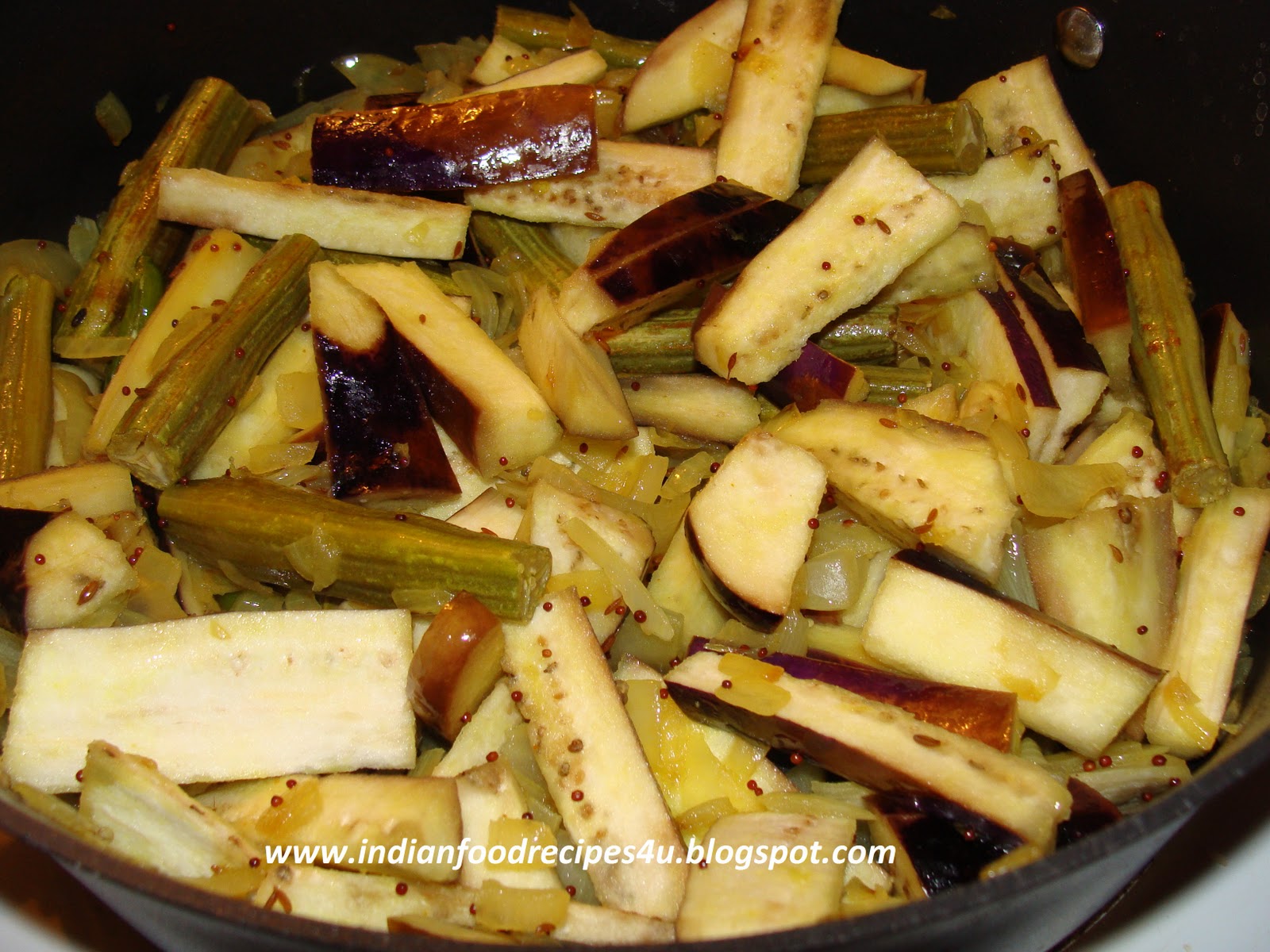 - Add the cut Eggplant/brinjal, drumstick pieces and turmeric powder, red chili powder and salt to taste and mix well. Place lid and cook over low flame for 5 minutes.