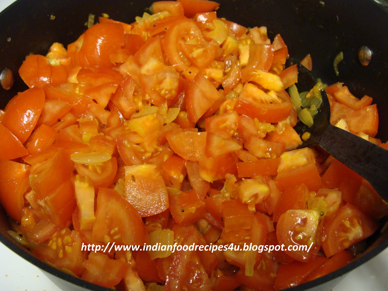 - Add the cubed tomatoes and turmeric powder and mix it. Place lid and cook over low flame for 12-15 minutes. Mix in between so that it does not stick to the bottom of vessel.