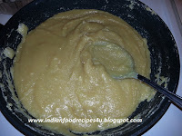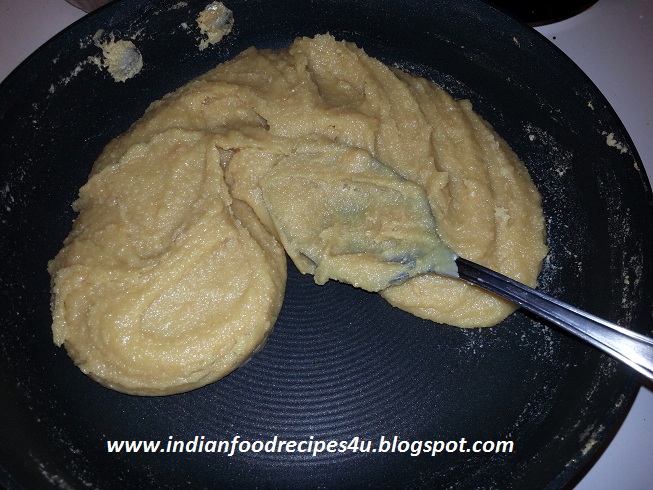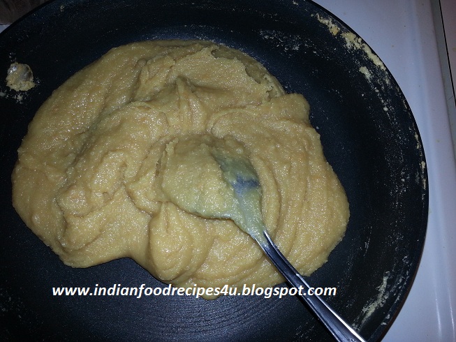 - Now add sugar and cook on medium heat. As sugar melts, the mixture turns into thin mixture. Continue stirring until the mixture thickens and leaves sides of the pan as shown in the below pictures.